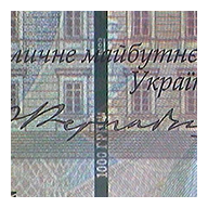 The thread features the denomination “1,000” and Ukraine’s small coat of arms. When looked at from different angles, the thread produces a dynamic light effect