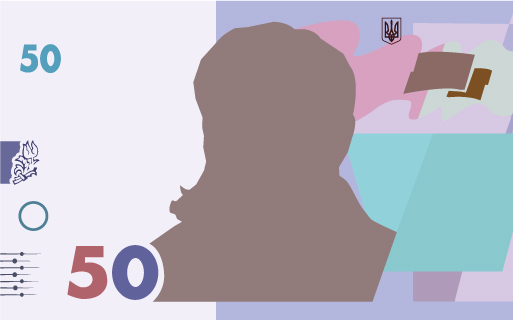A stripe, fully imbedded into the paper, on which the words “UAH 500”, an element of Ukraine’s small coat of arms (the trident), and the underlined denomination figure “500” can be seen as direct and inverse images under a magnifying glass