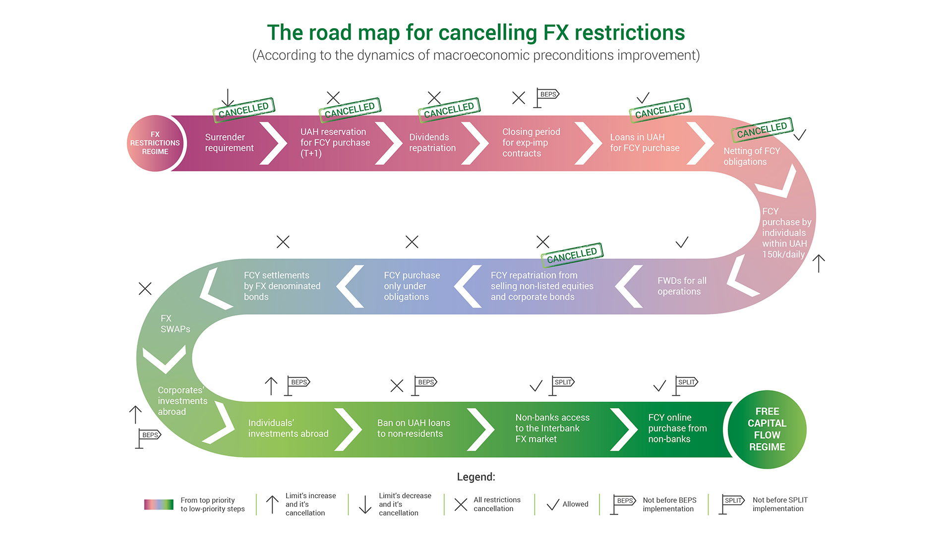 The NBU pursues the ultimate goal of removing all current restrictions and making possible a transition to free movement of capital, a regime that will lay the groundwork for easing the conduct of business, improving the investment climate in Ukraine, attracting foreign capital, and ensuring sustainable economic growth.