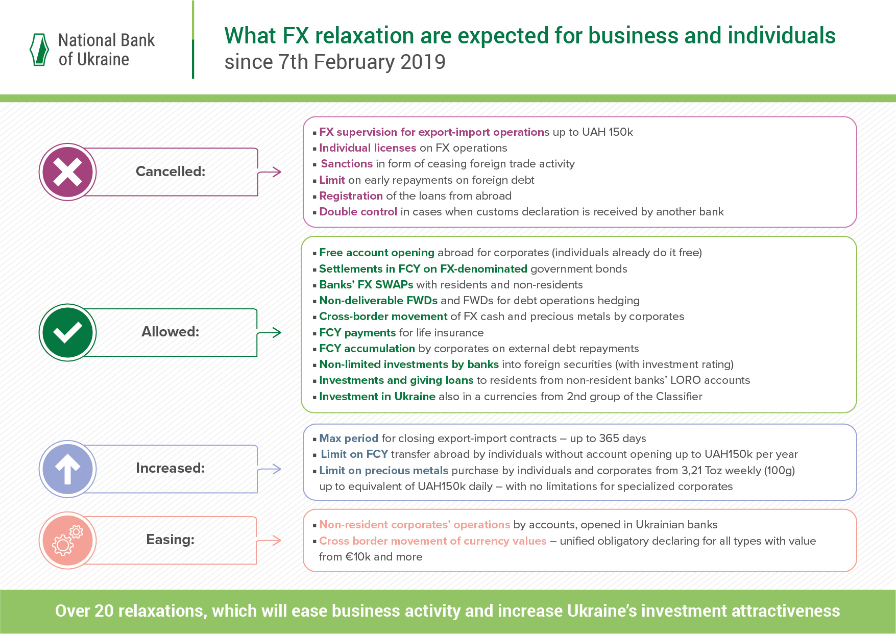 The new regulation introduces a number of measures to ease the conduct of business in the FX market and increase Ukraine’s investment appeal. Overall, the NBU will introduce more than 20 easing measures on 7 February that are intended to: